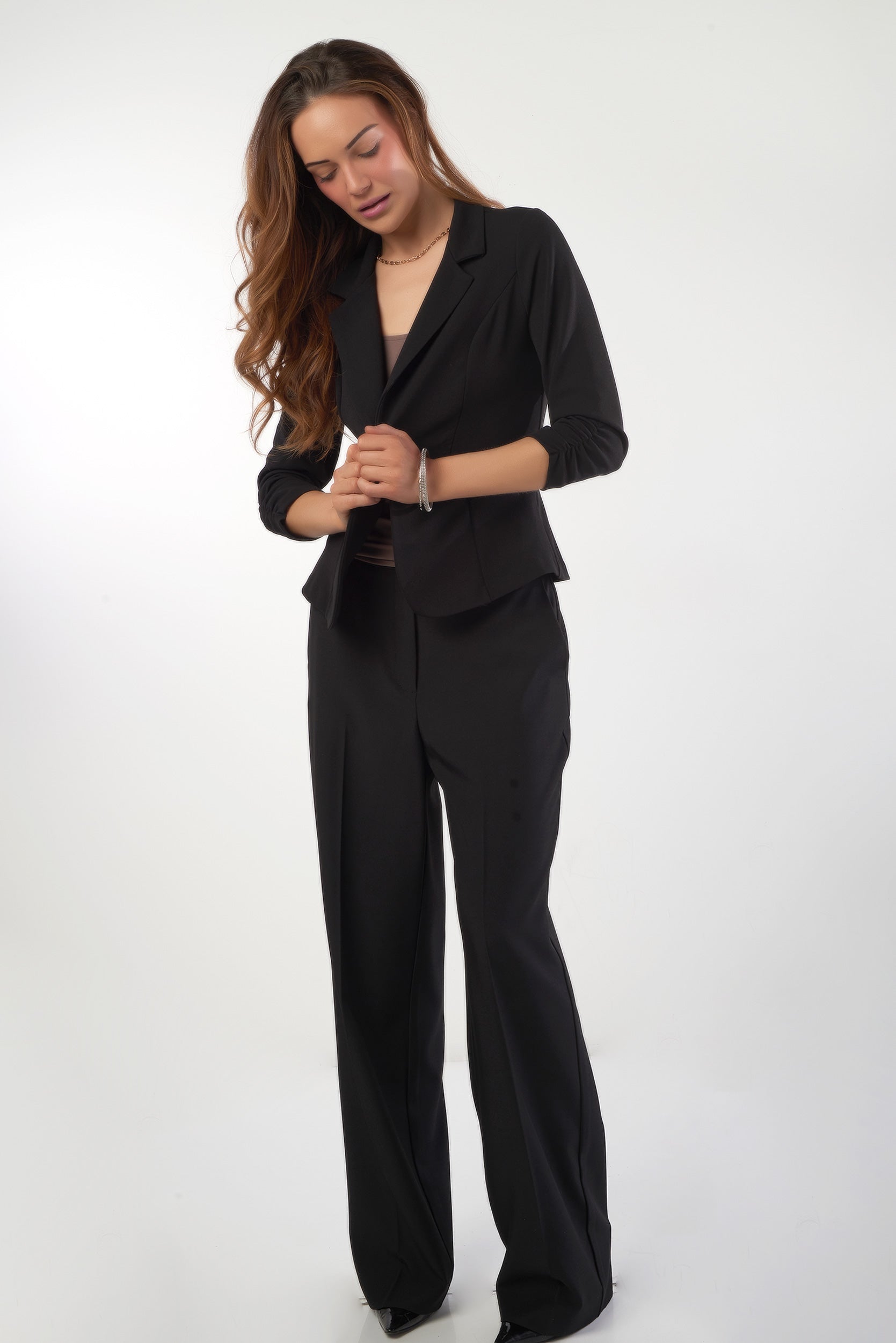 Doté d’un col tailleur classique, d’une fermeture à bouton unique et de manches 3/4 froncées, ce veston ajusté pour femme apporte une touche sophistiquée à toutes vos tenues.