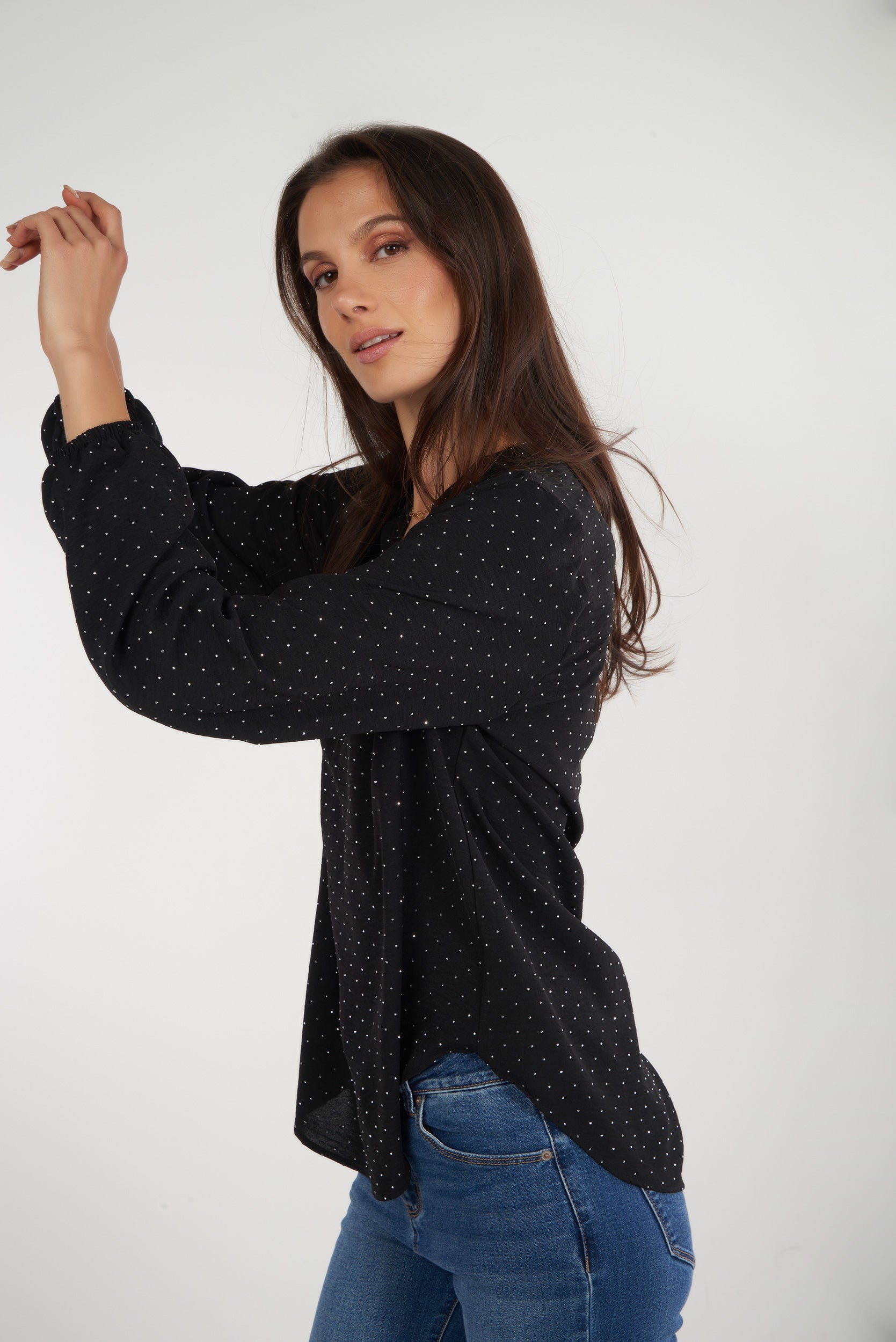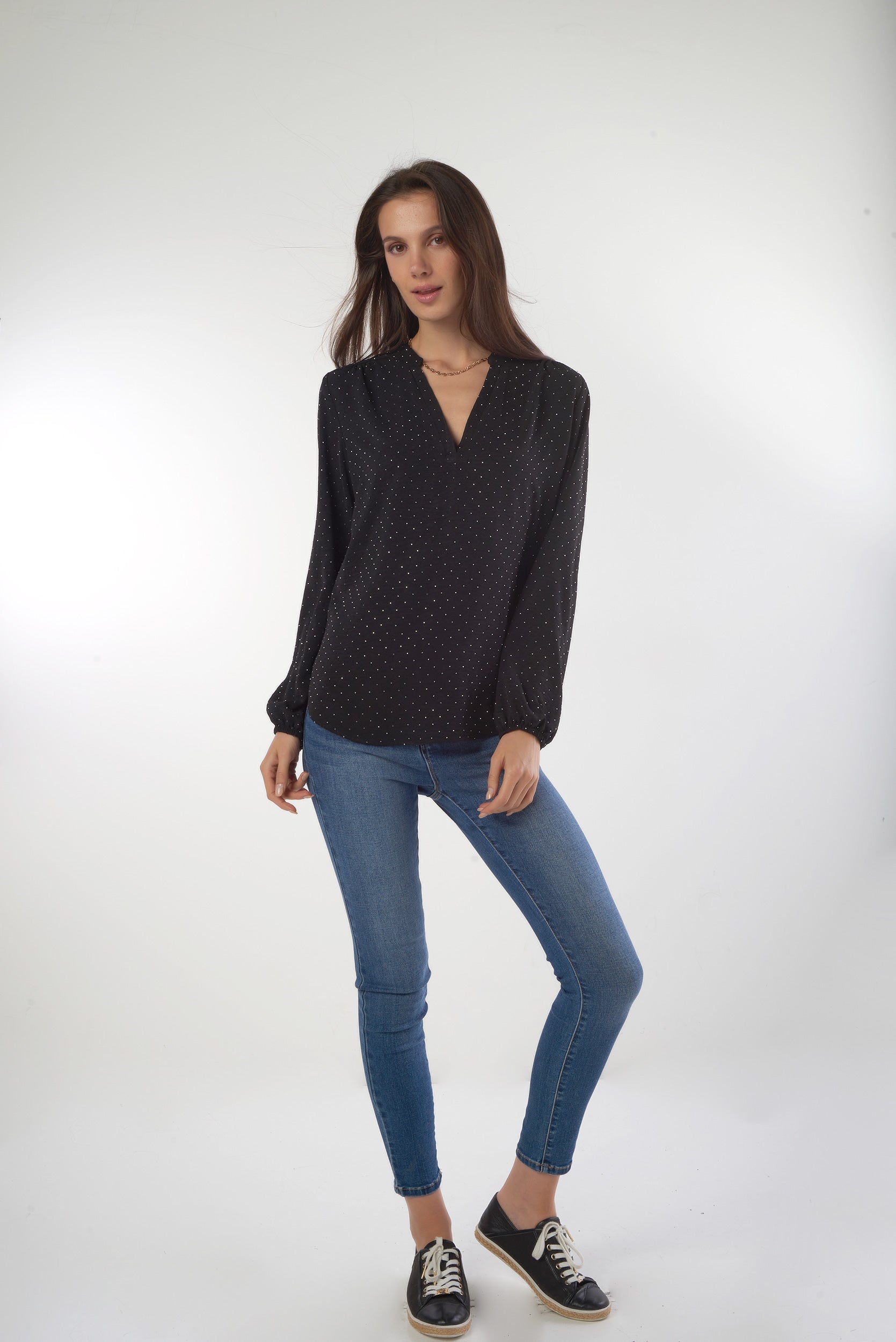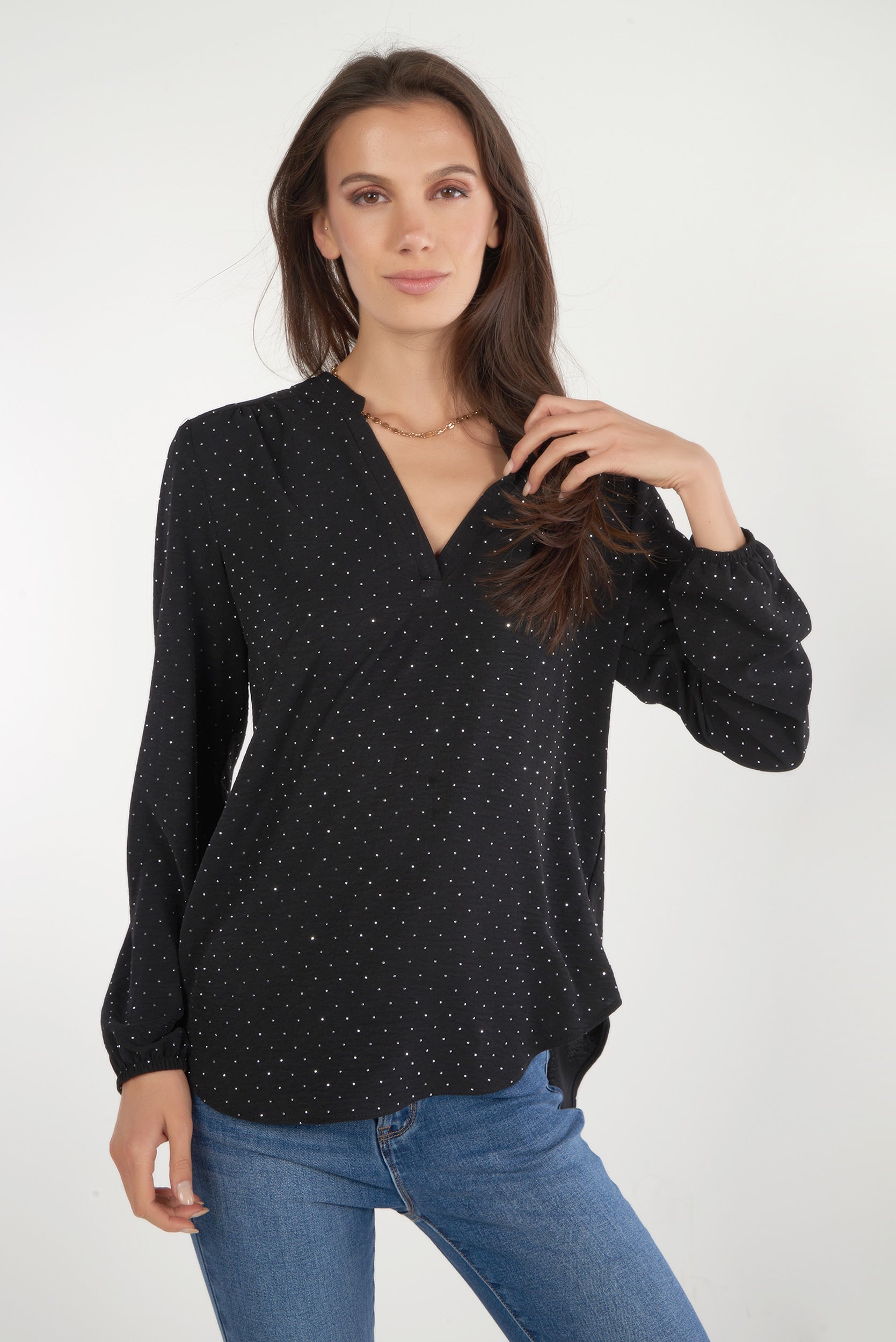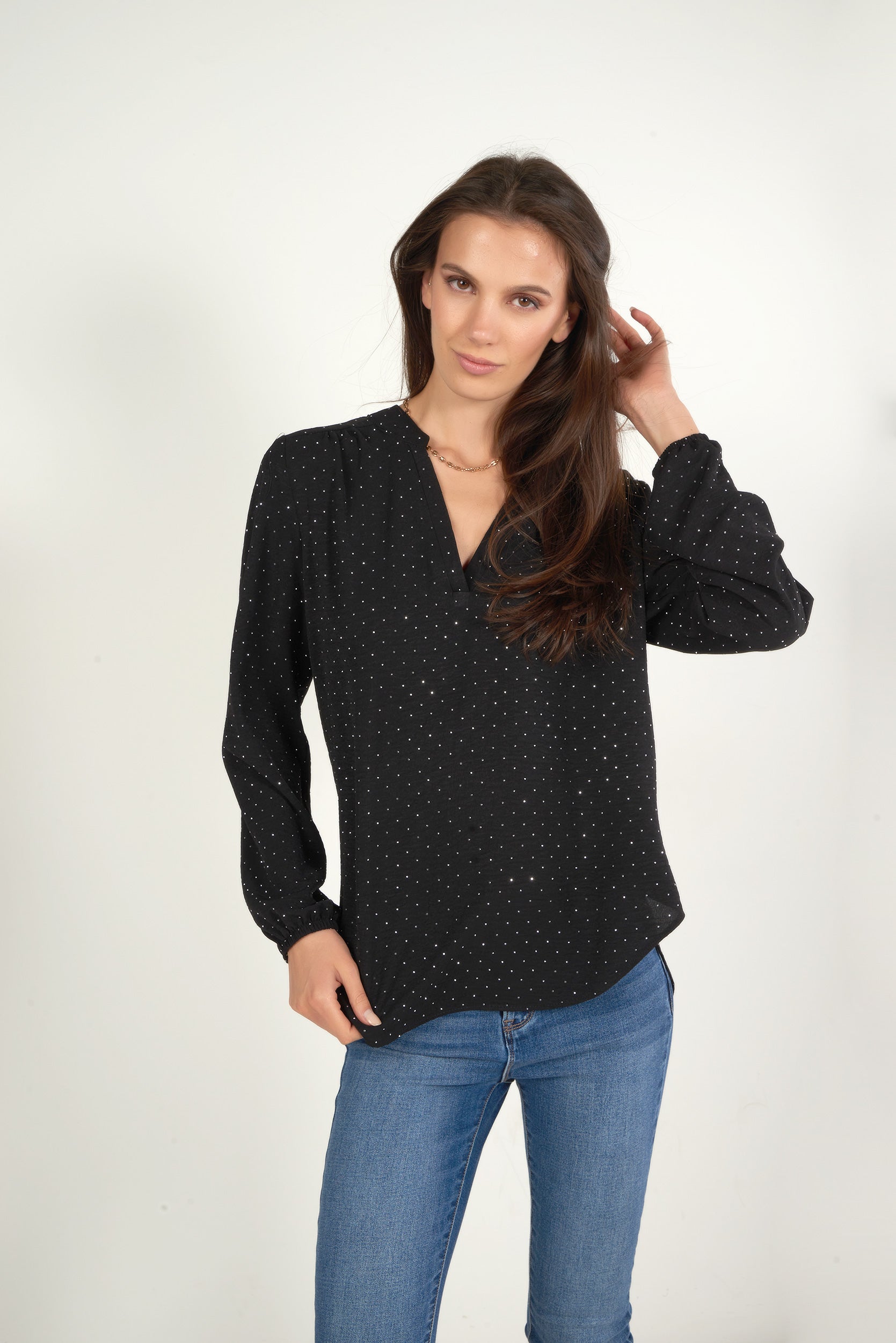 Découvrez une de nos blouses classiques avec une touche d'originalité : notre blouse pour femme ARISTAH. Avec ses manches longues, son encolure en V et ses pierres, ce haut pour femme est parfait pour rehausser vos looks dans la simplicité et l'élégance.