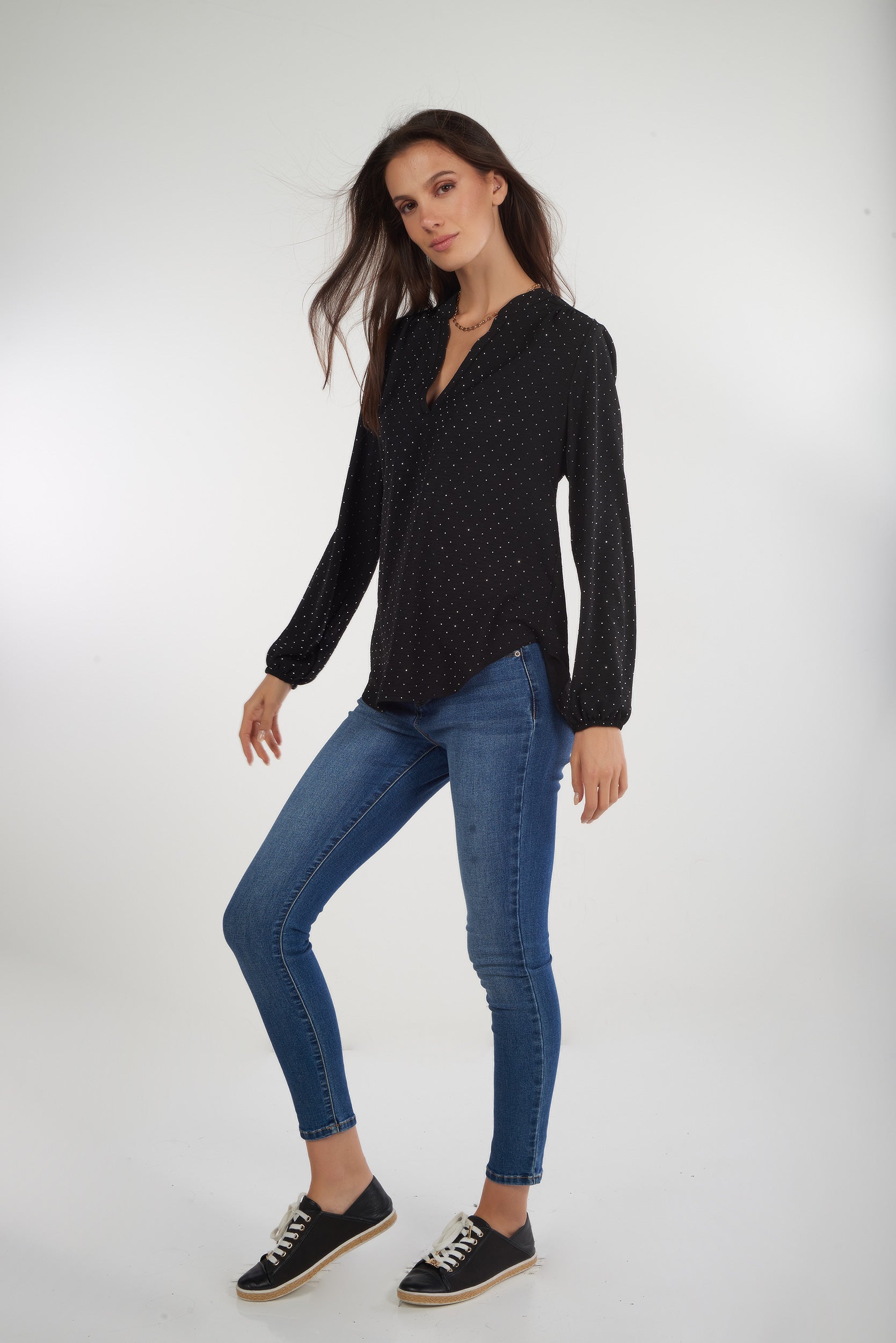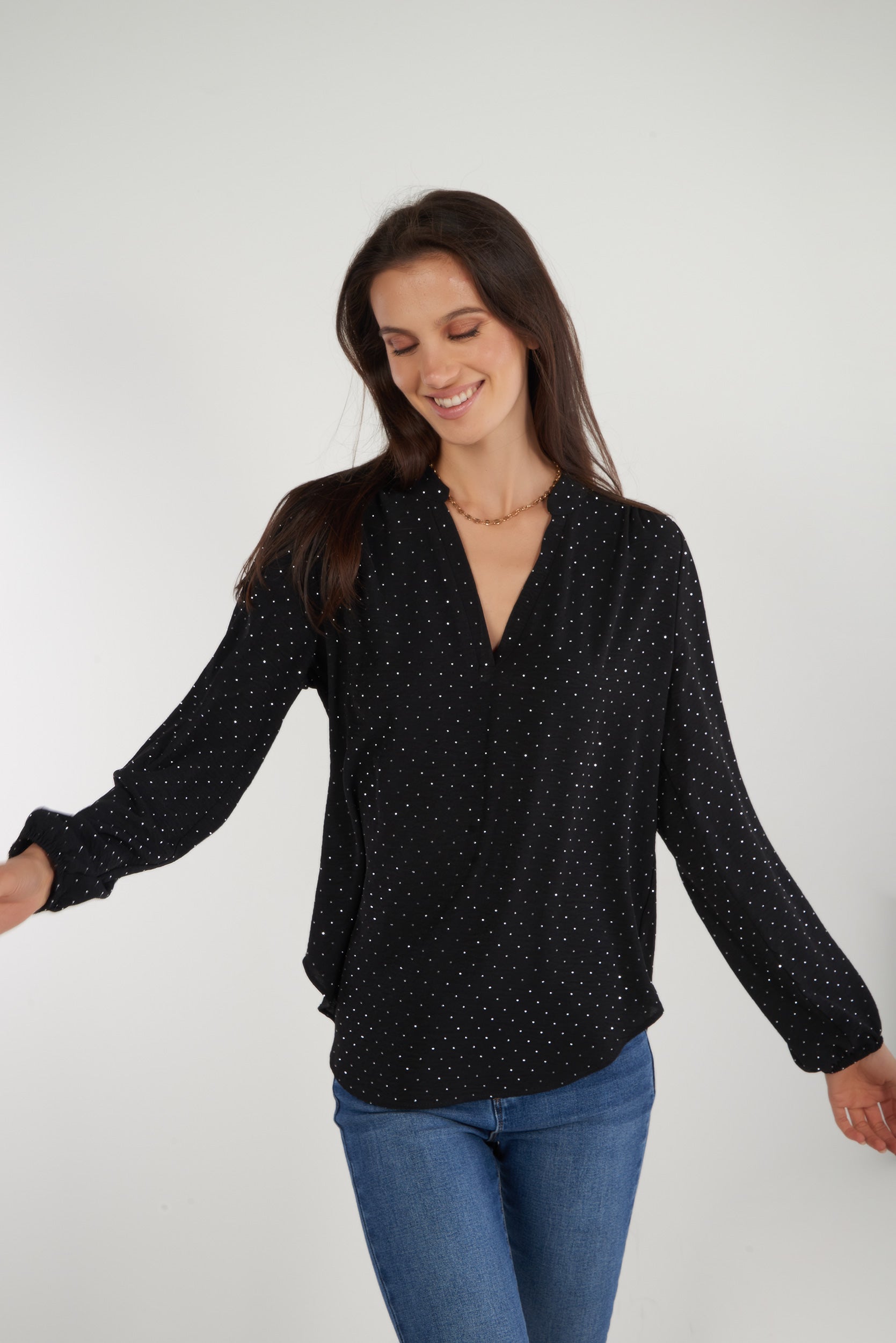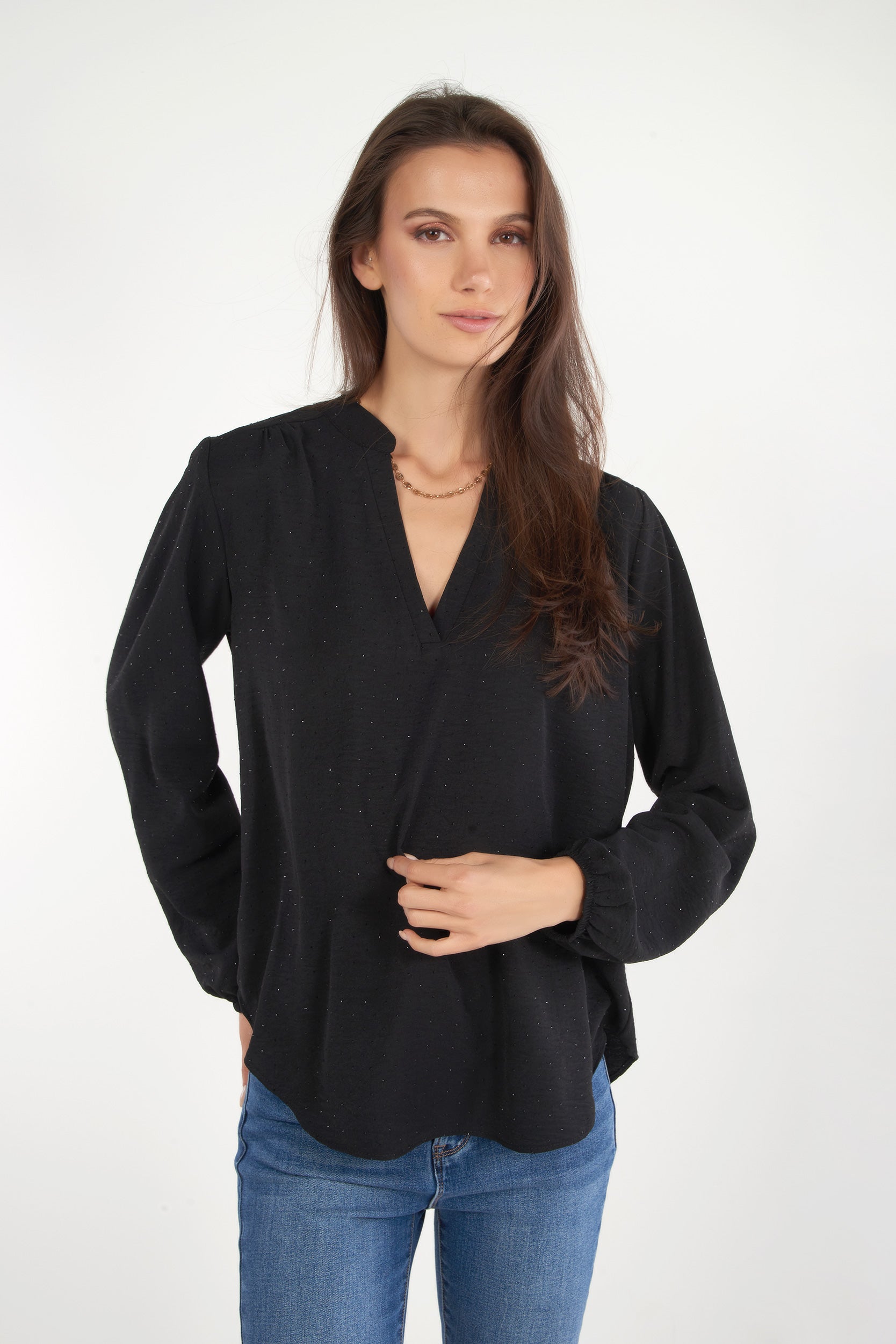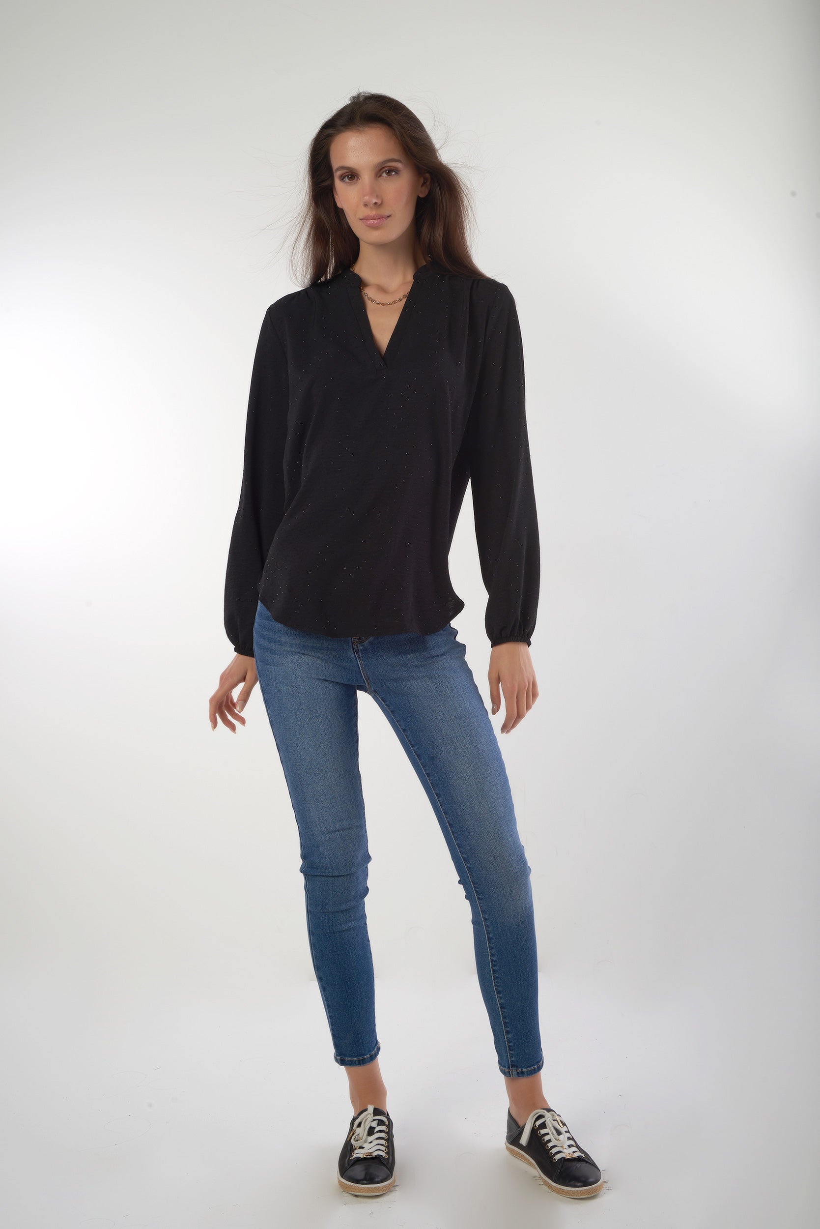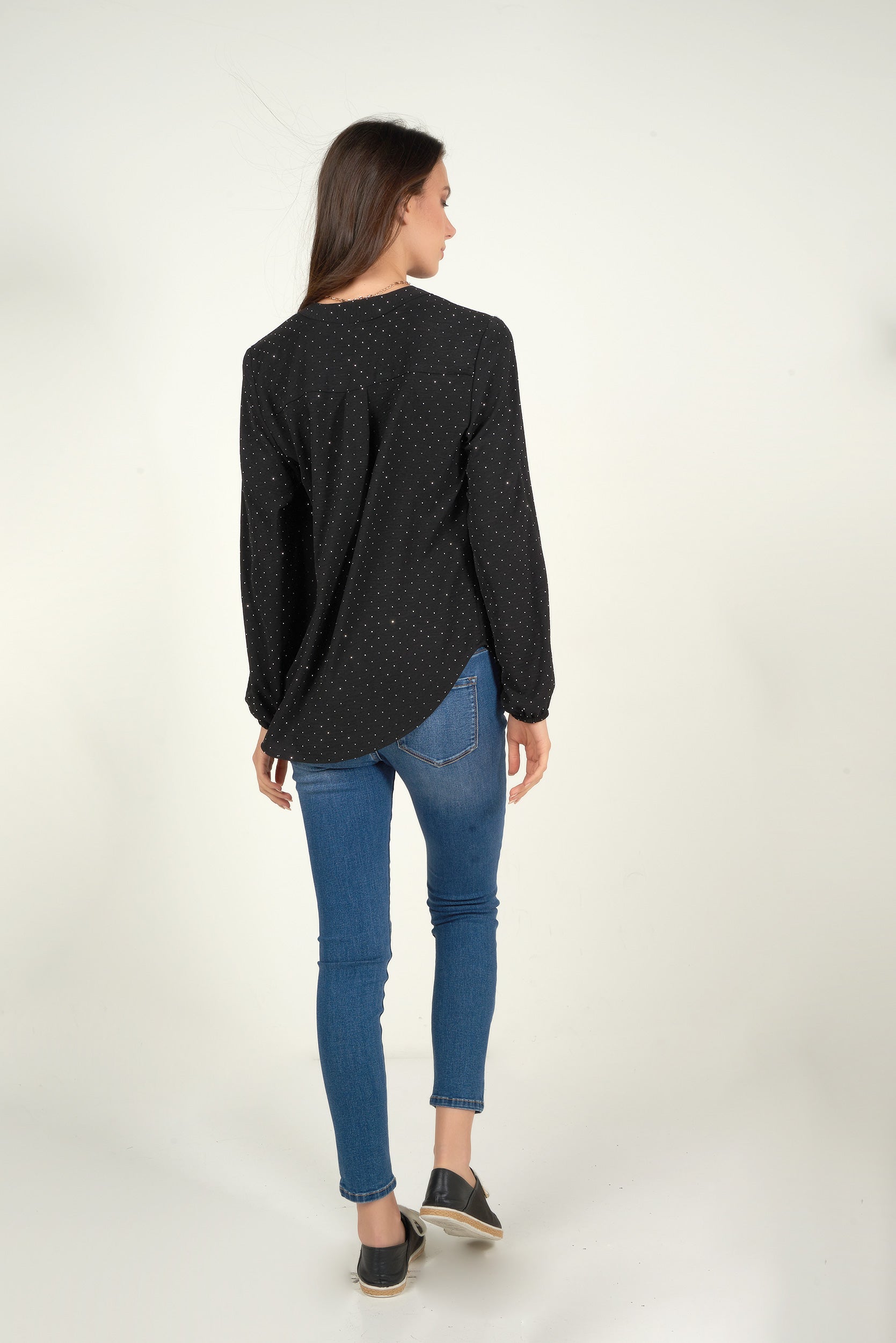 Découvrez une de nos blouses classiques avec une touche d'originalité : notre blouse pour femme ARISTAH. Avec ses manches longues, son encolure en V et ses pierres, ce haut pour femme est parfait pour rehausser vos looks dans la simplicité et l'élégance.
