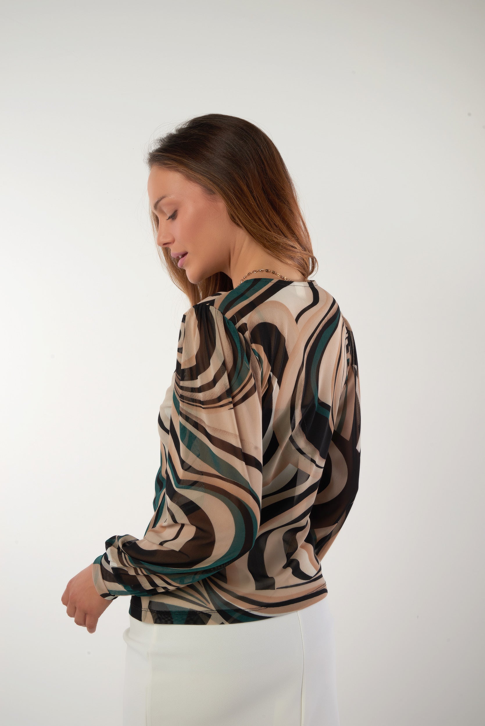 Ajoutez élégance et originalité à votre style grâce à notre haut en mesh pour femme Sulia. Ce haut imprimé est doté de manches longues et bouffantes avec poignets ajustés et d'un col rond.