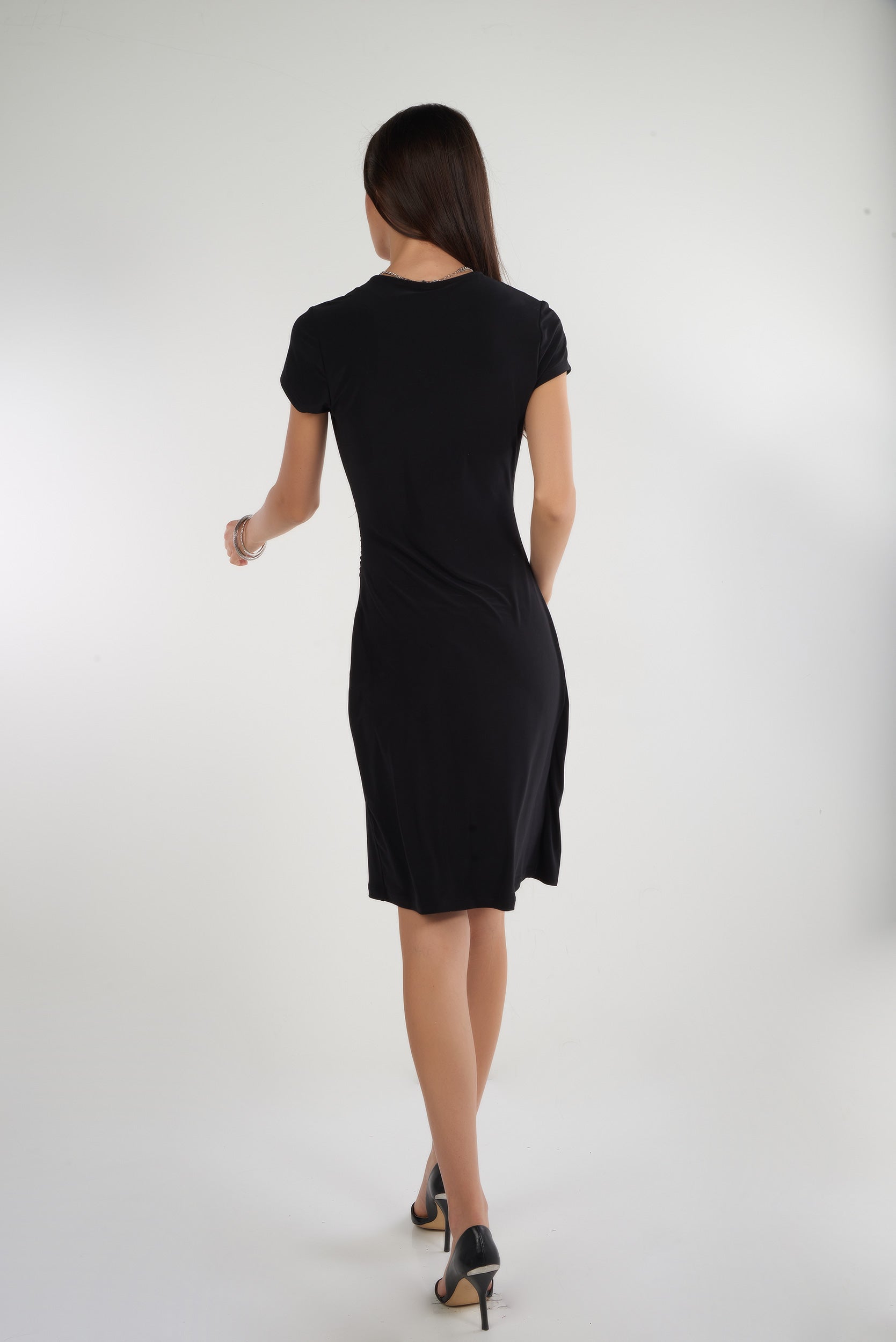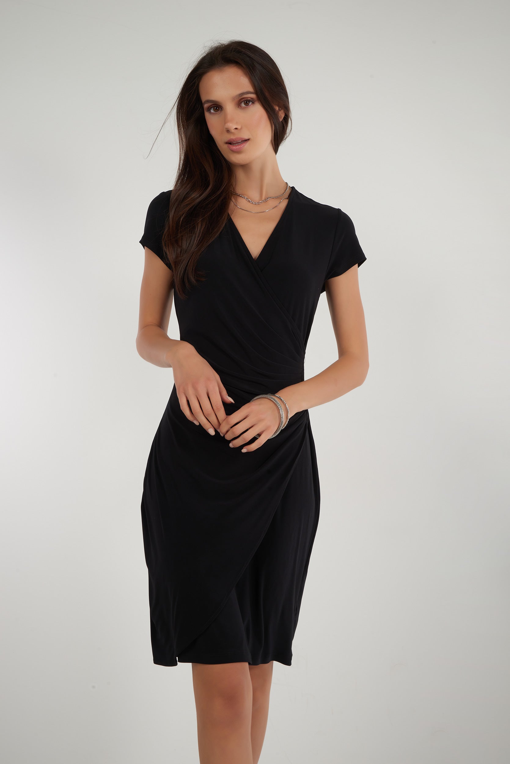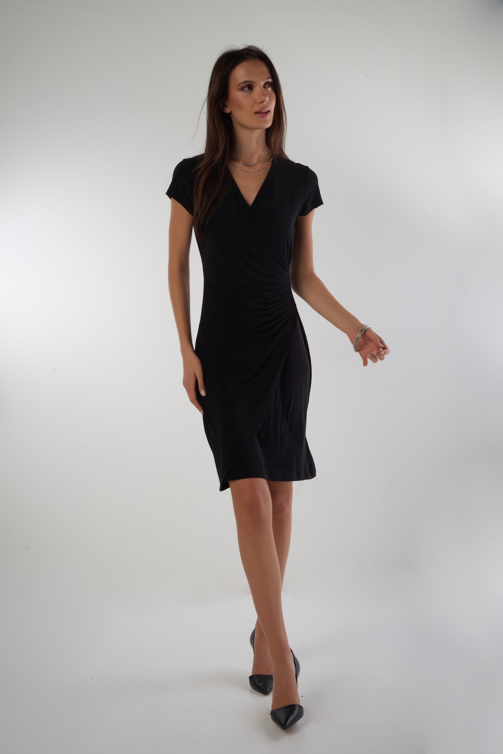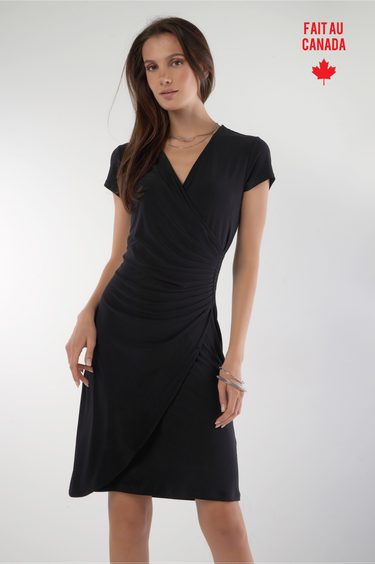 Découvrez votre nouvel essentiel quotidien avec notre robe courte pour femme Chi-Solid. Une pièce alliant style, confort et élégance avec sa coupe droite, son col en V, ses plis sur le côté et son style cache-coeur.
