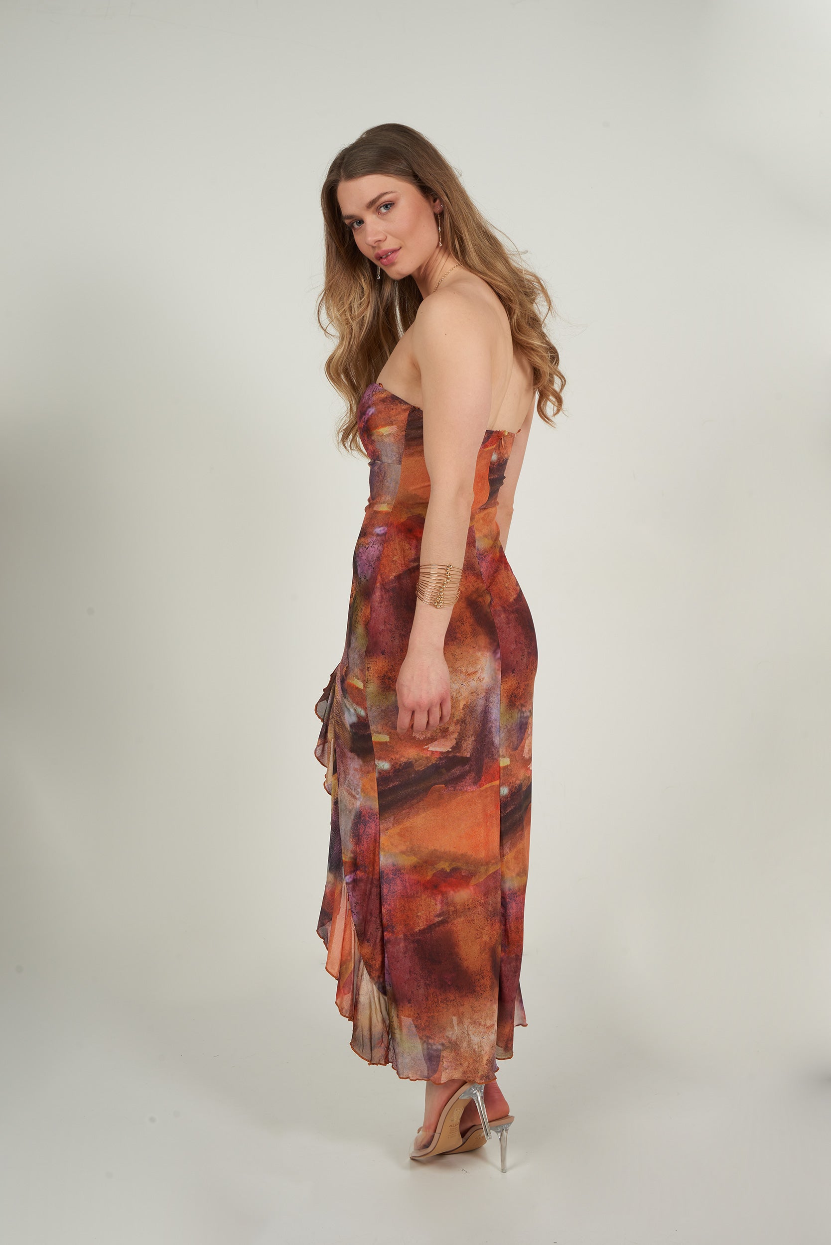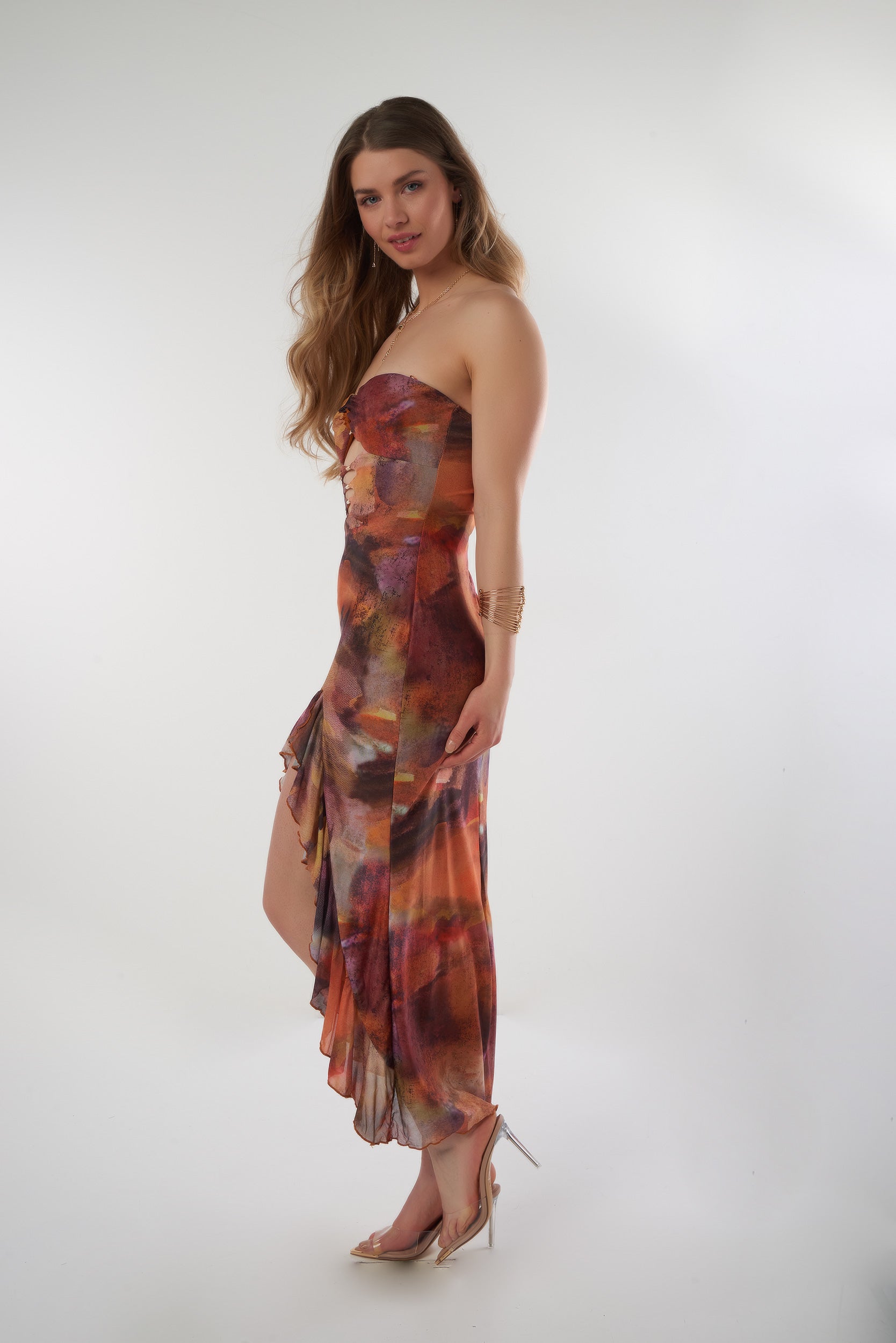 Fall in love with this long glamorous and ultra sensual dress, made to turn heads wherever you go.Its artistic print with warm and vibrant tones creates a truly unique and sophisticated look. Featuring a structured bandeau top with lace-up details, it enhances your silhouette with bold femininity.