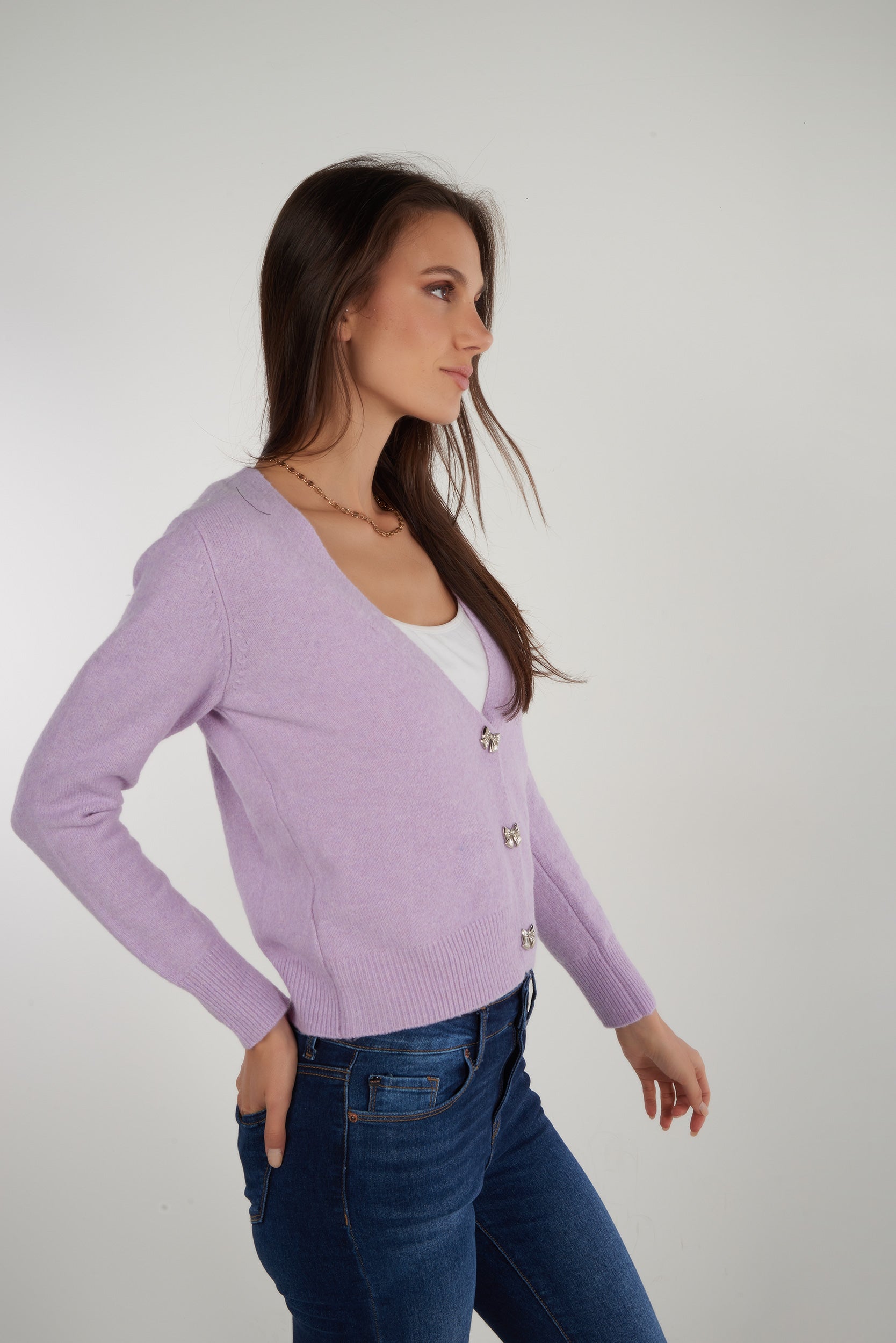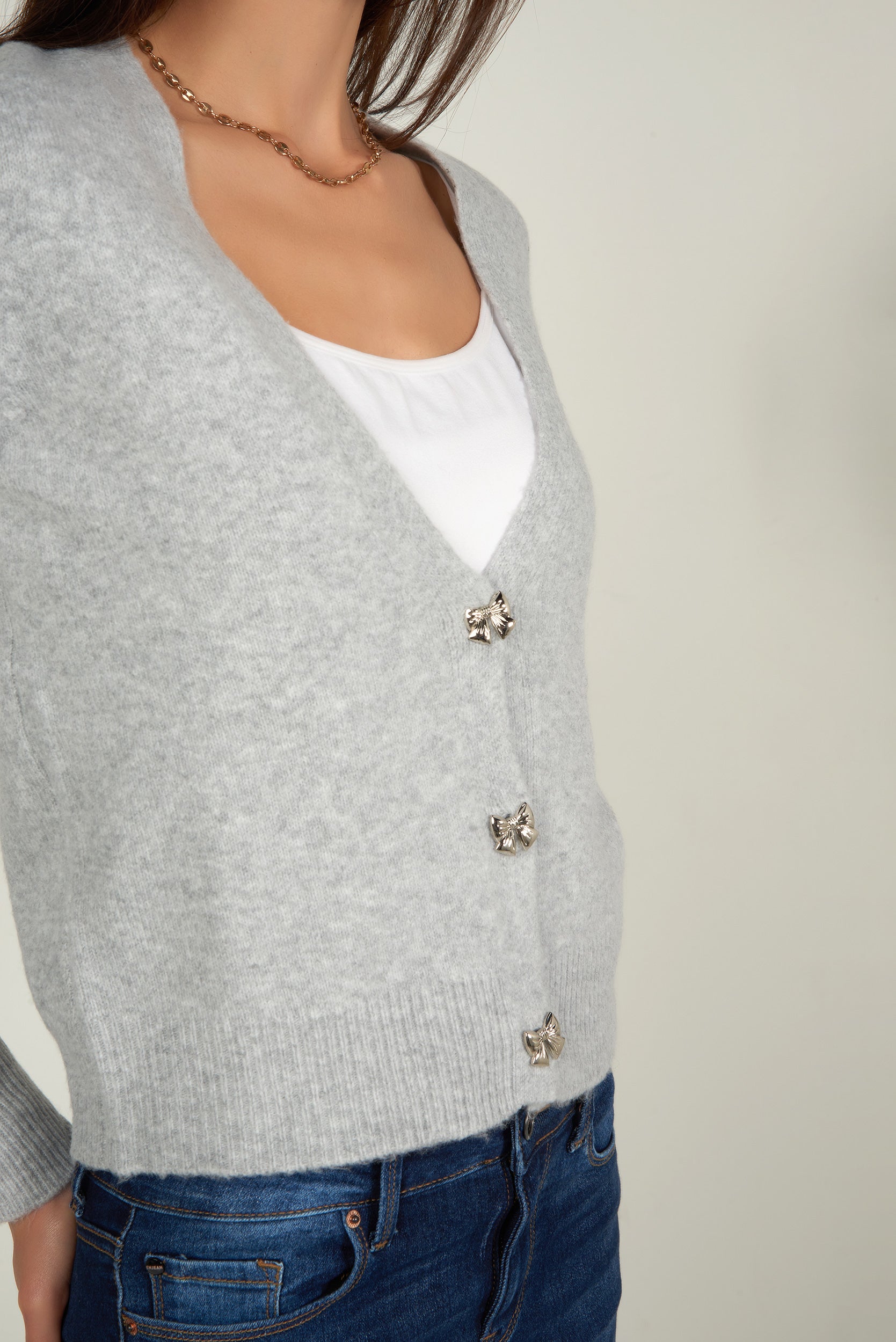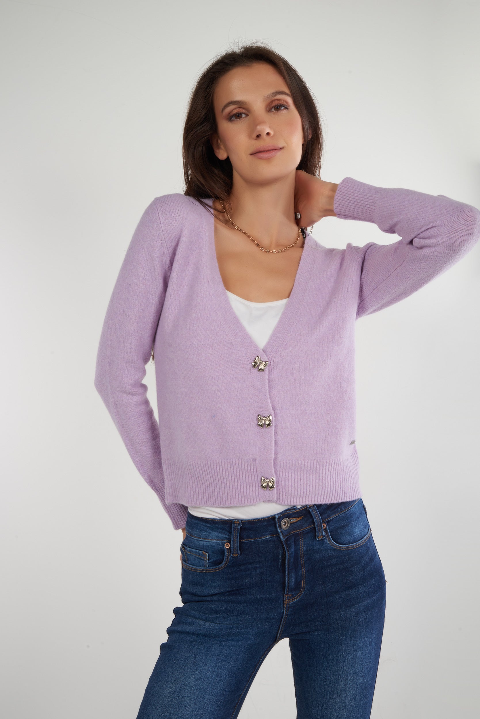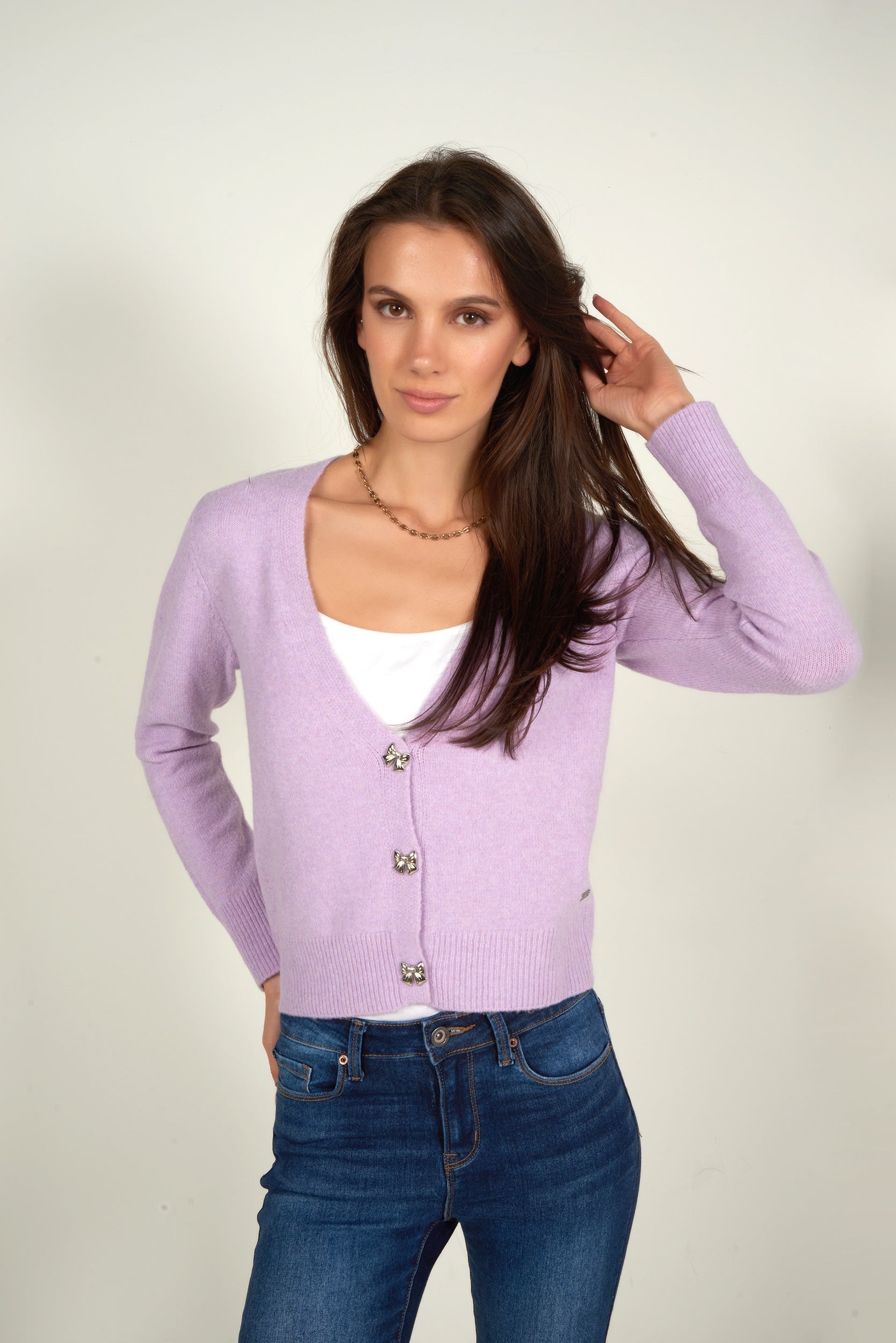 Discover the new favorite piece in your wardrobe: our Clo women's cardigan. With its long sleeves, bow buttons, ribbed hems, V-neck, and cropped fit, it perfectly combines style, elegance, and comfort. Available in two colors: gray cardigan and lilac cardigan.