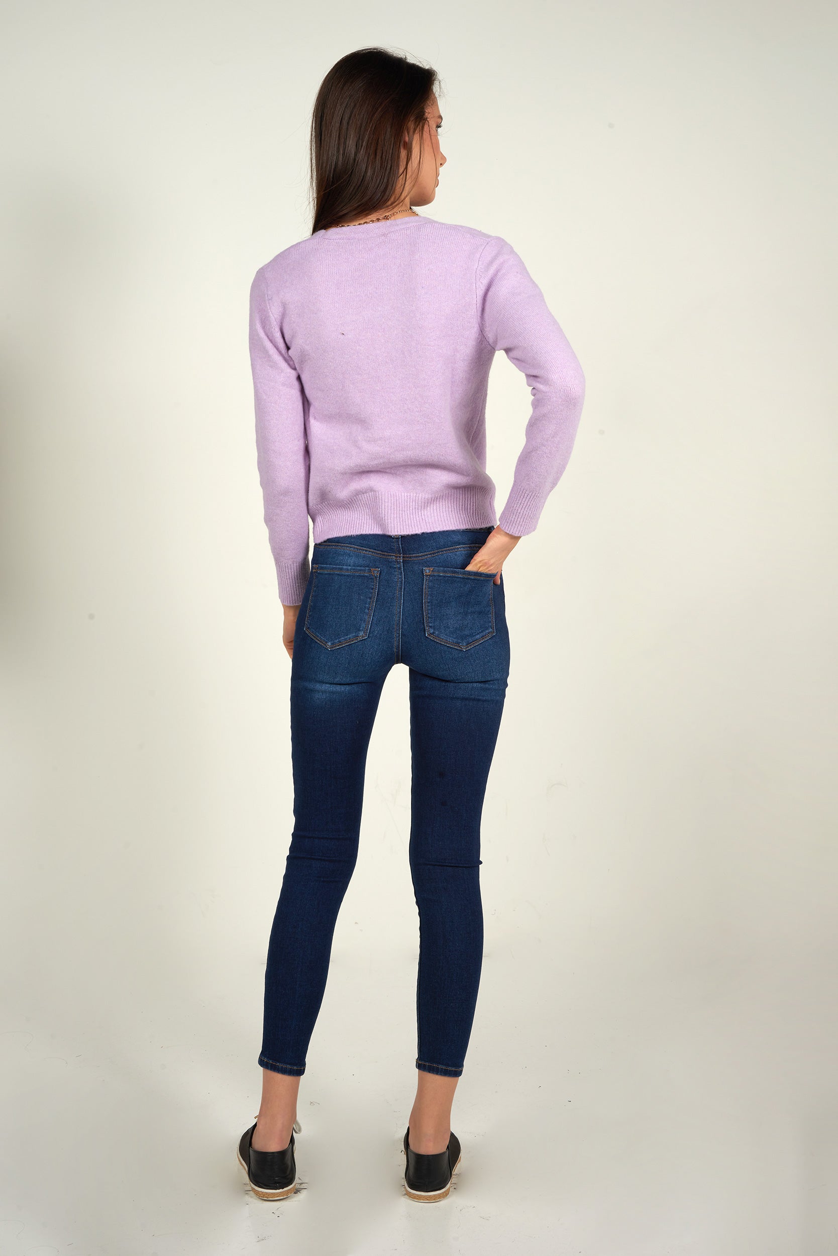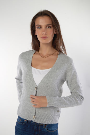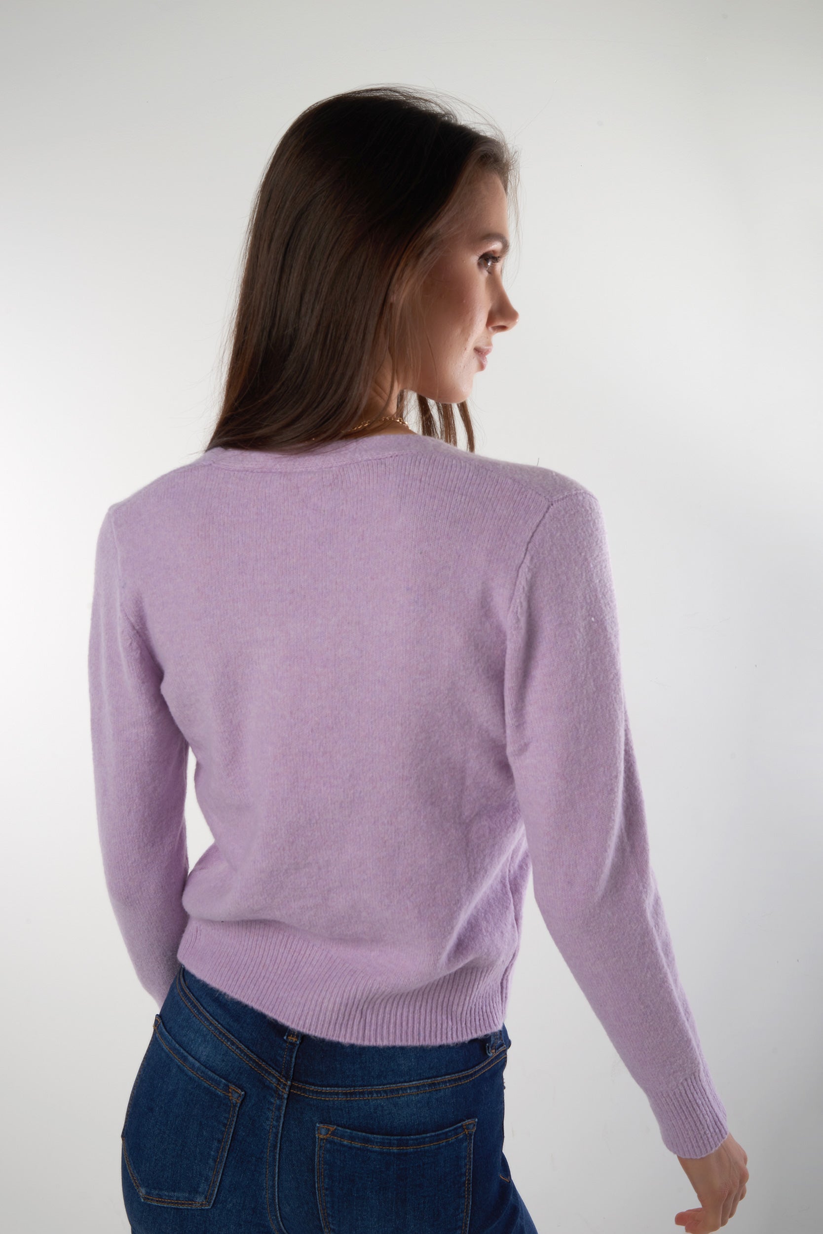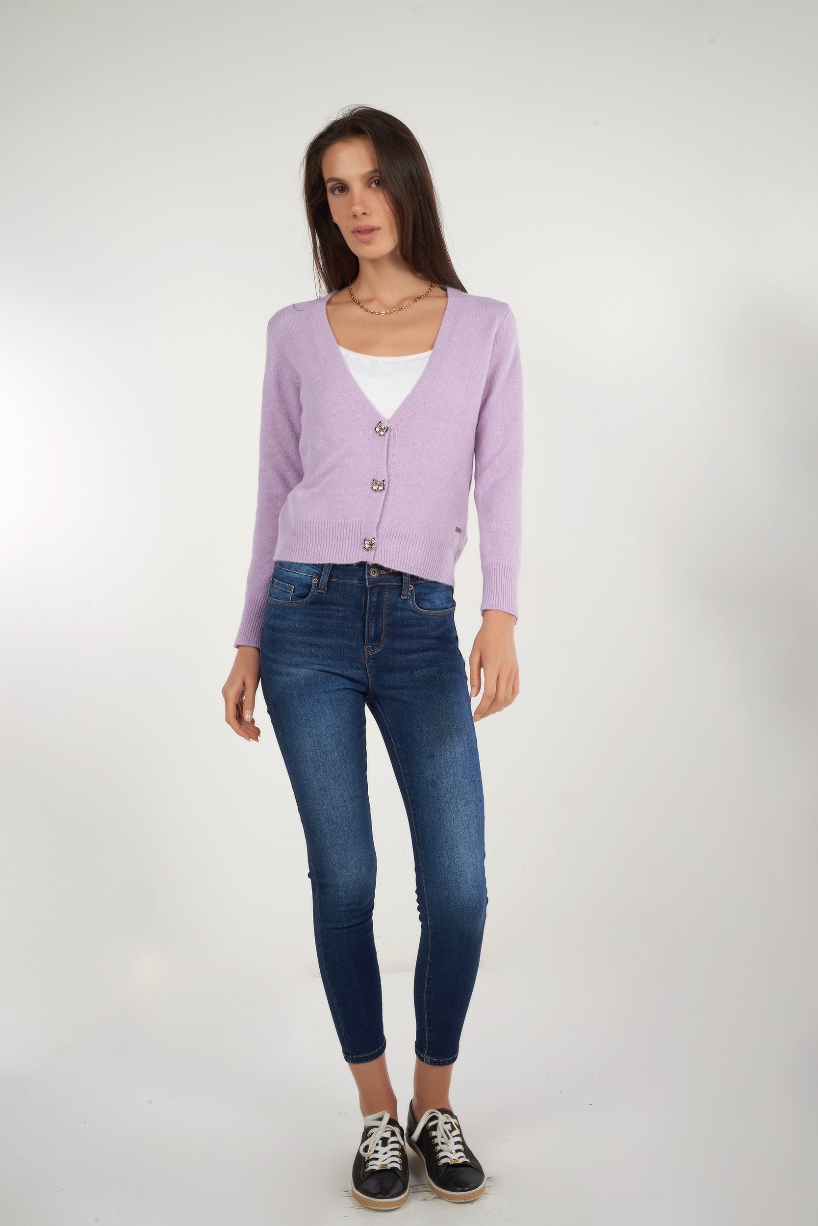 Discover the new favorite piece in your wardrobe: our Clo women's cardigan. With its long sleeves, bow buttons, ribbed hems, V-neck, and cropped fit, it perfectly combines style, elegance, and comfort. Available in two colors: gray cardigan and lilac cardigan.