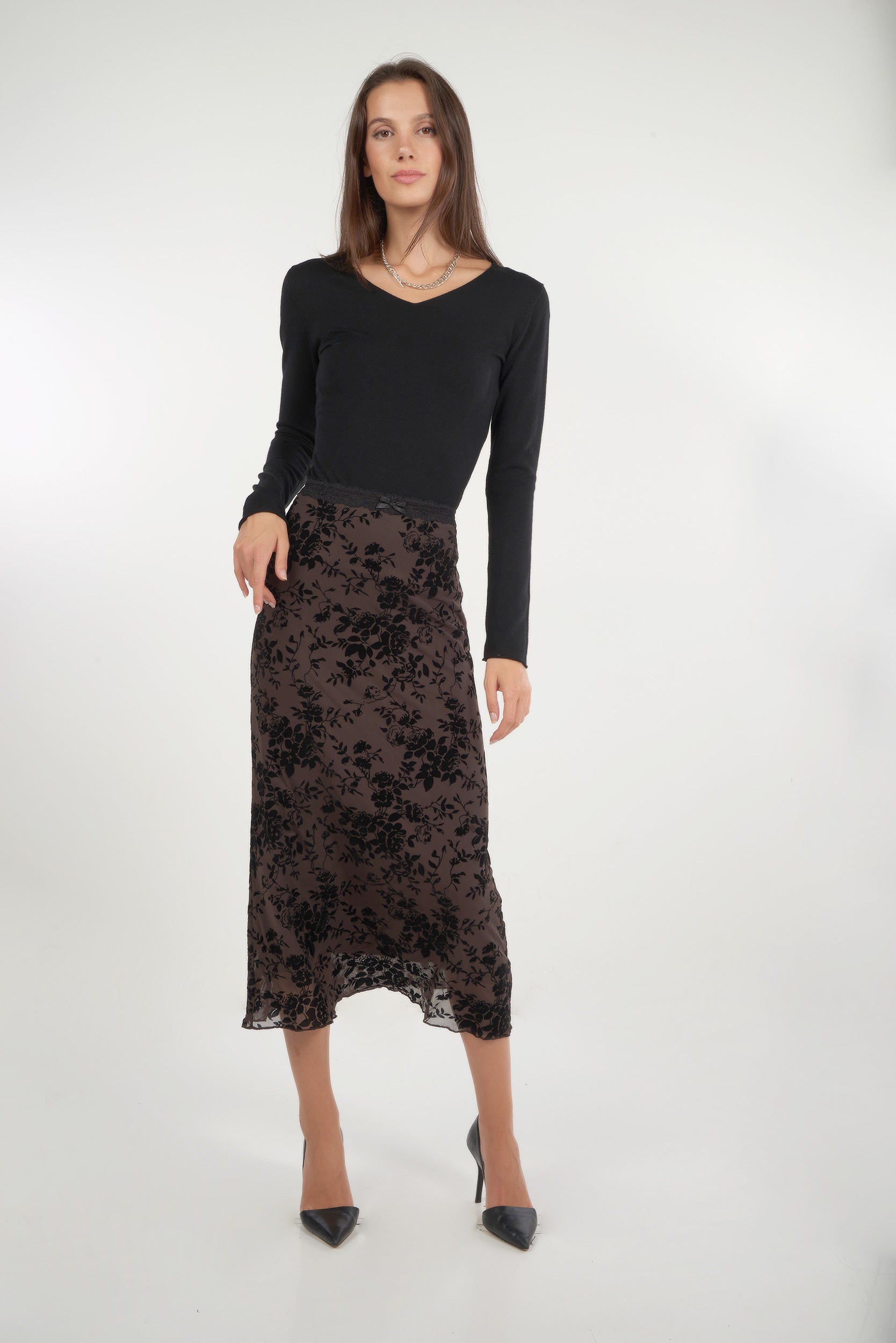 Add elegance and romance to your outfits with our MB1290 maxi skirt. Its mesh fabric, velour floral print, lace and bow details at the waistband, and straight fit are the elements that give this skirt its charm!