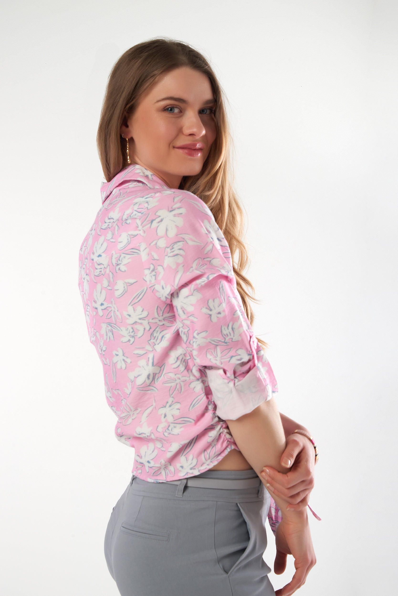 This blouse instantly charms with its delicate floral print and soft, luminous pink tone. Made from a lightweight, fluid, breathable fabric, it provides all-day comfort while beautifully enhancing the silhouette. Its feminine, flattering cut, elegant collar, and refined button closure make it easy to wear and style. Perfect for a romantic, chic, and versatile look, from everyday wear to special occasions.