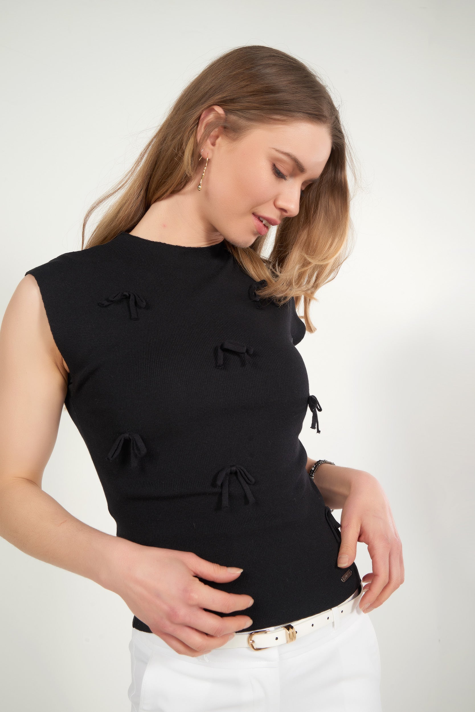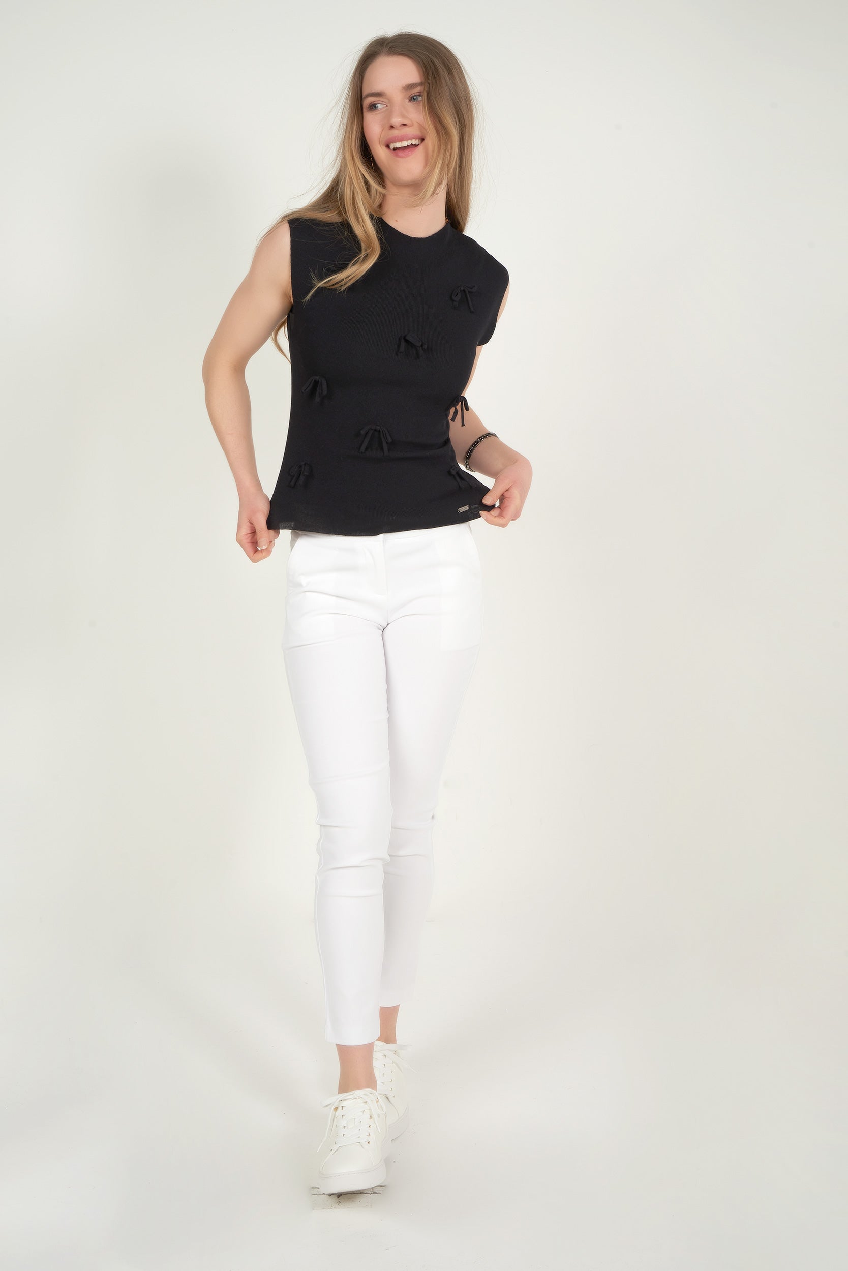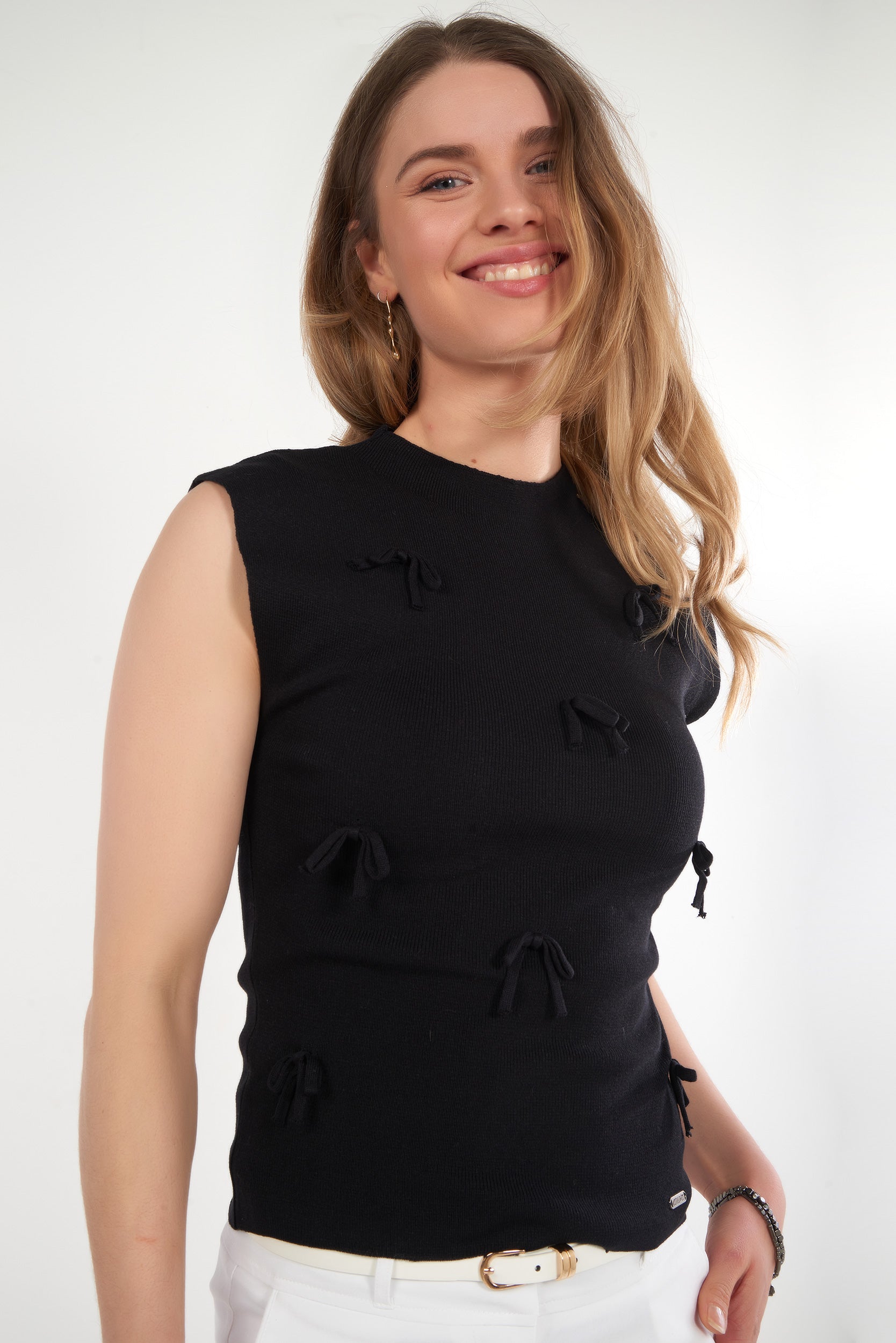 This women’s sleeveless top made from soft knit fabric stands out with its delicate and refined design, accented by small decorative bows that add a touch of romantic femininity. Its lightweight and comfortable fabric ensures all-day wearability. A chic and romantic fashion essential that instantly adds charm to both casual and dressy outfits.