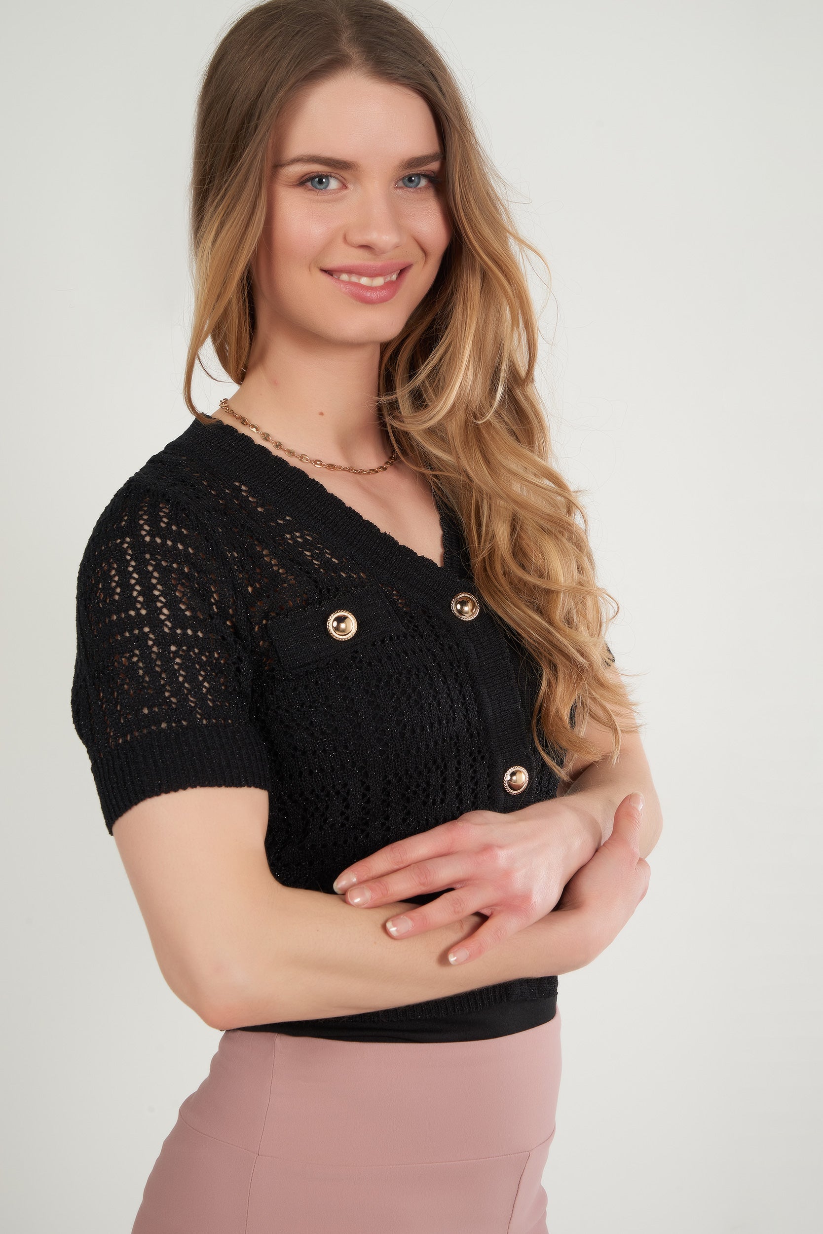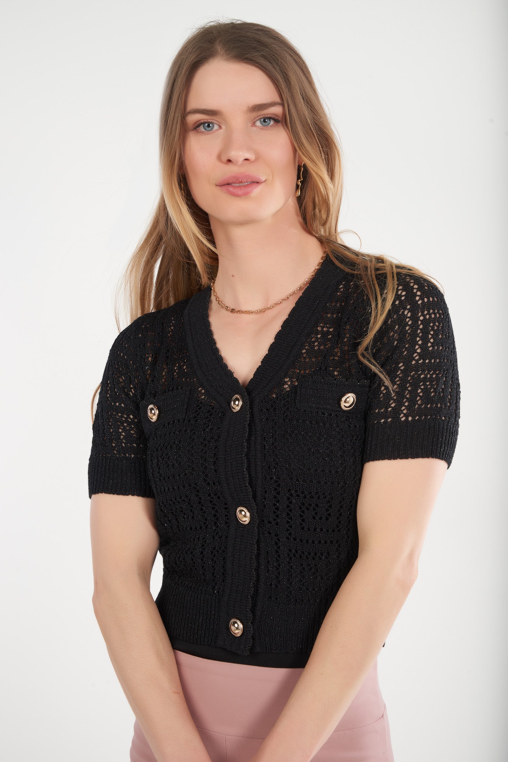 This DONA openwork knit cardigan stands out with its chic and sophisticated style, perfect for instantly elevating any outfit. The decorative buttons add a modern, elegant touch, while its subtle shimmer effect won’t disappoint— ideal for a polished, effortless look. A versatile and timeless piece that can be worn both day and night.